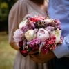 Buchet de cununie civila cu bujori, buvardia, trandafiri, frezii si hortensie. Buchet de dimensiune medie cu durata de viata de 1 zi.