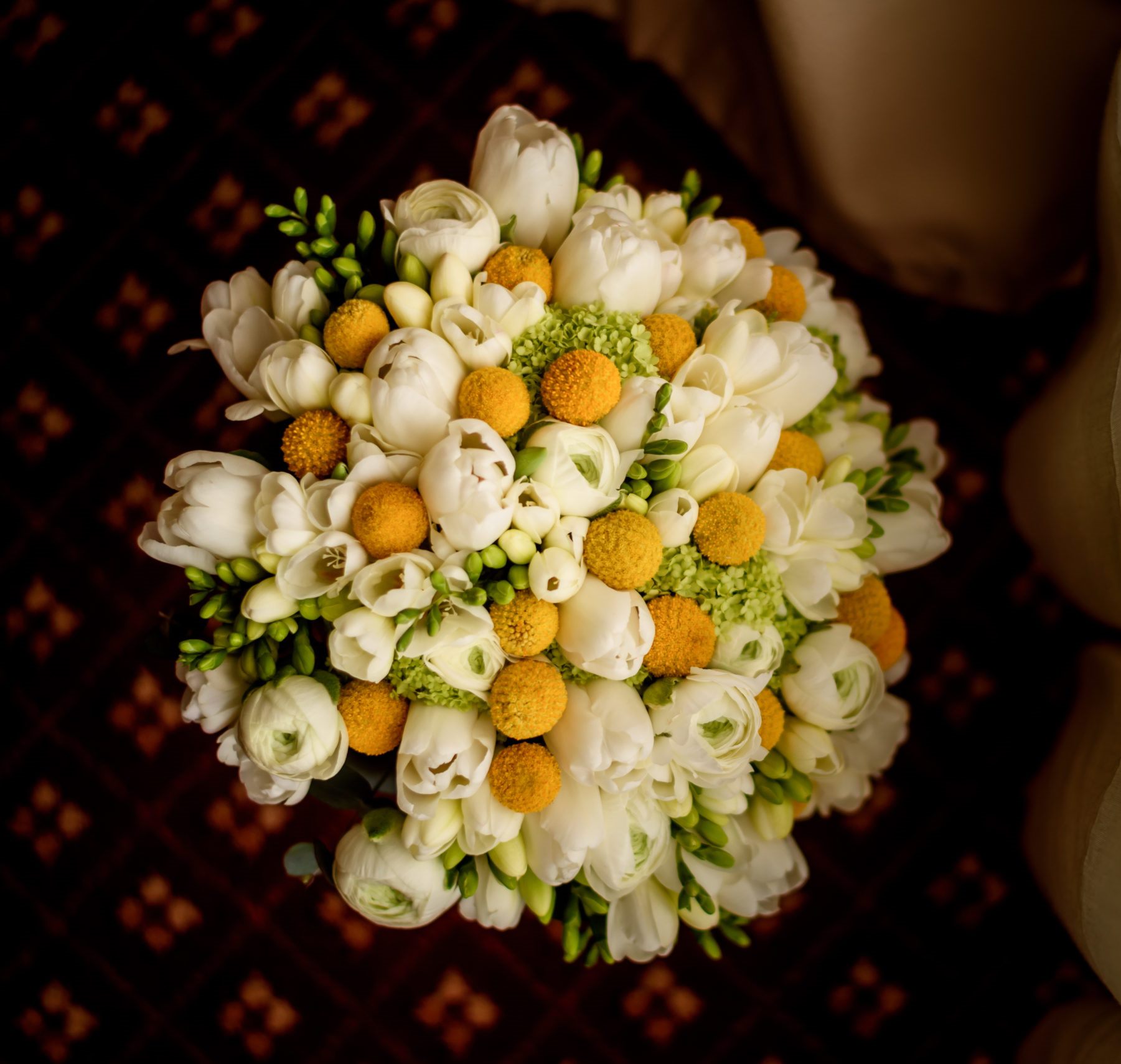 Buchet de mireasa realizat din frezii, craspedii, lalele, ranunculus. Buchet de dimensiune medie, cu o durata de viata de 8-12 ore. Este in sezon in perioada aprilie-octombrie.