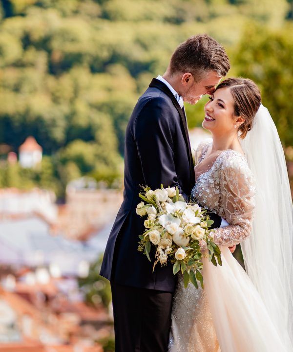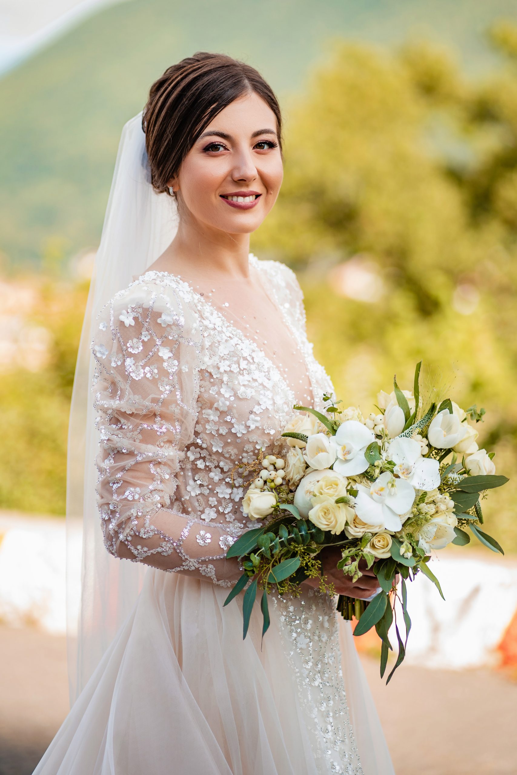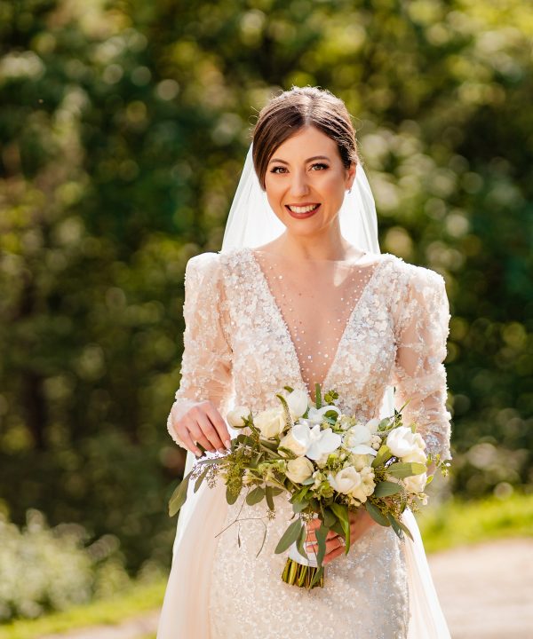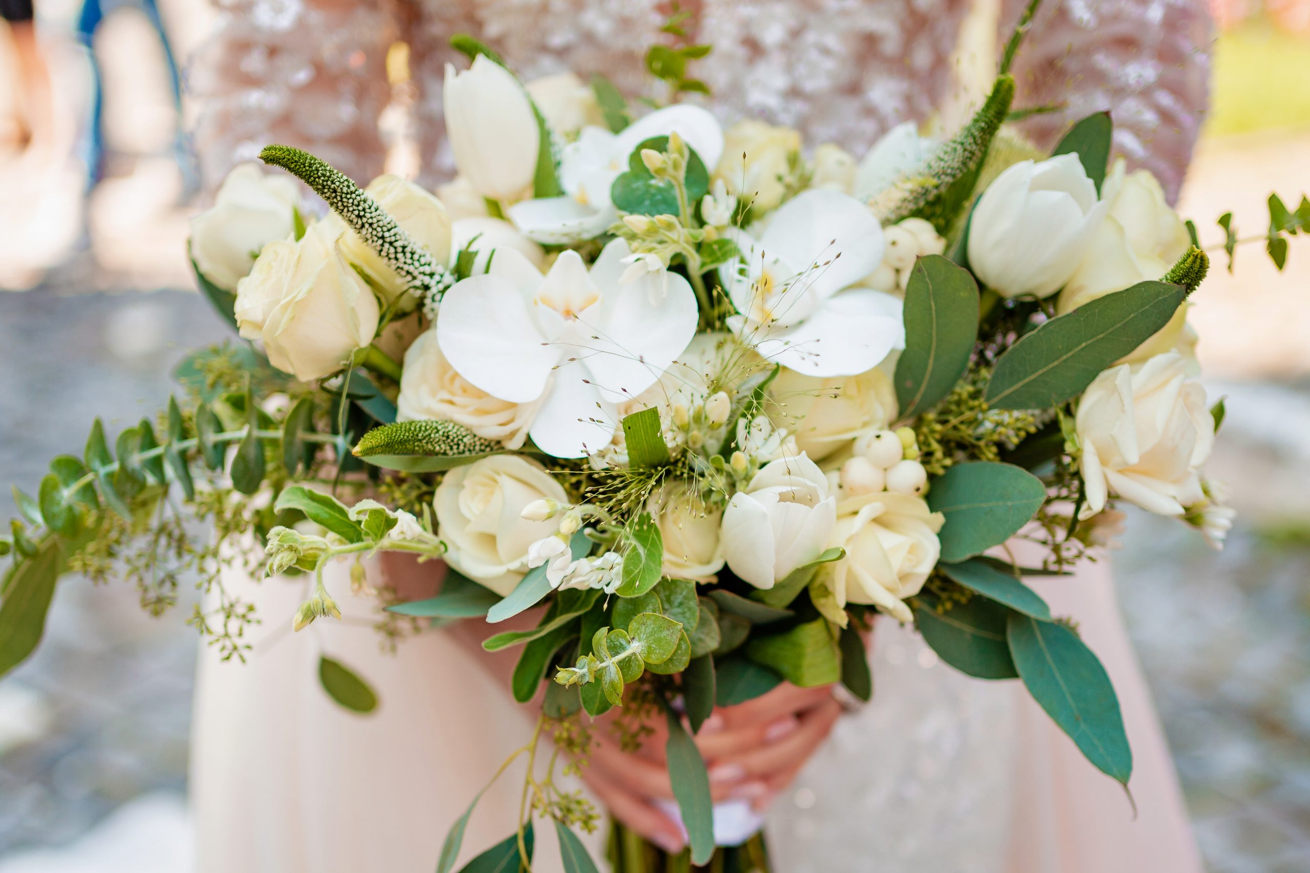 Buchet de mireasa bujori, lisianthus, eucalipt, orhidee. Buchet de dimensiune mare cu durata de viata de 1 zi.