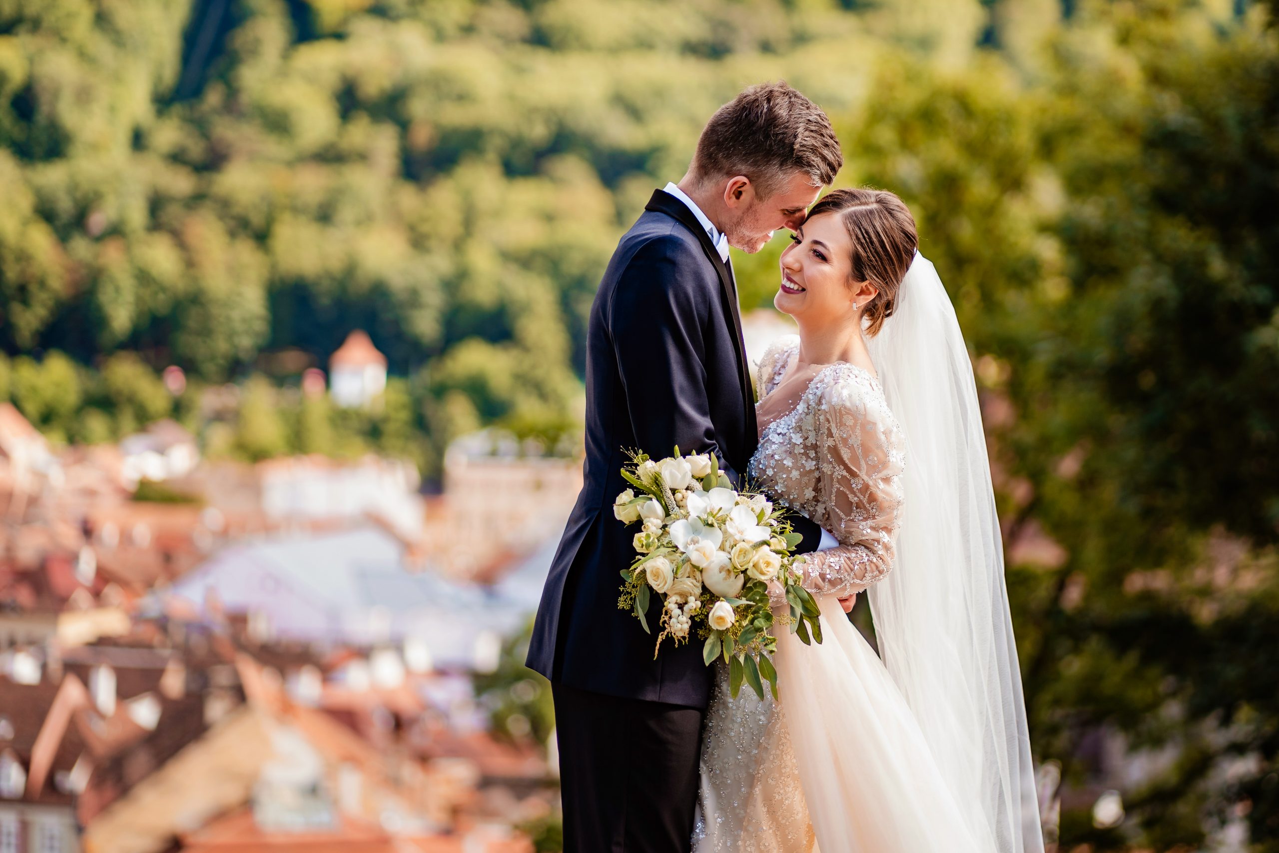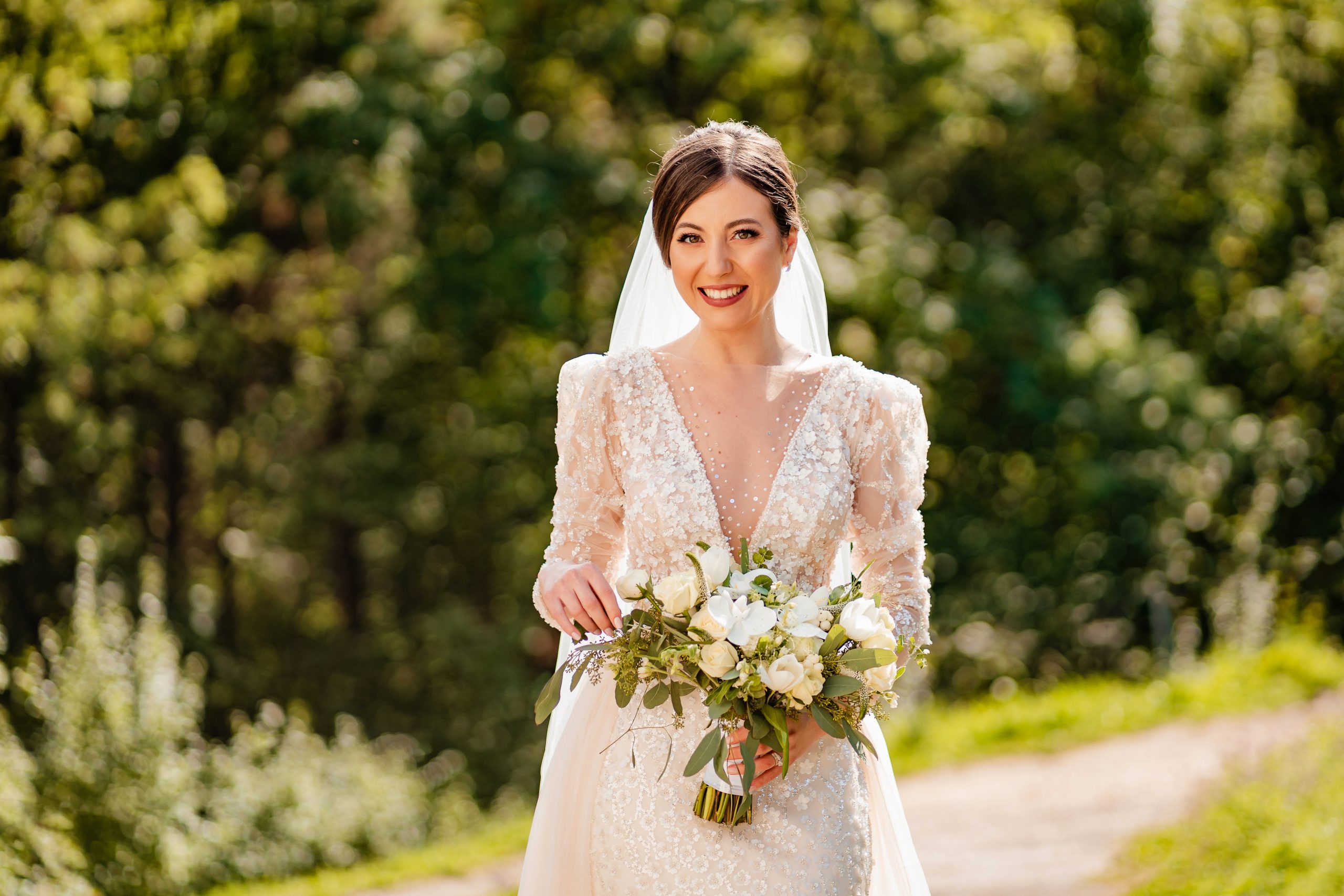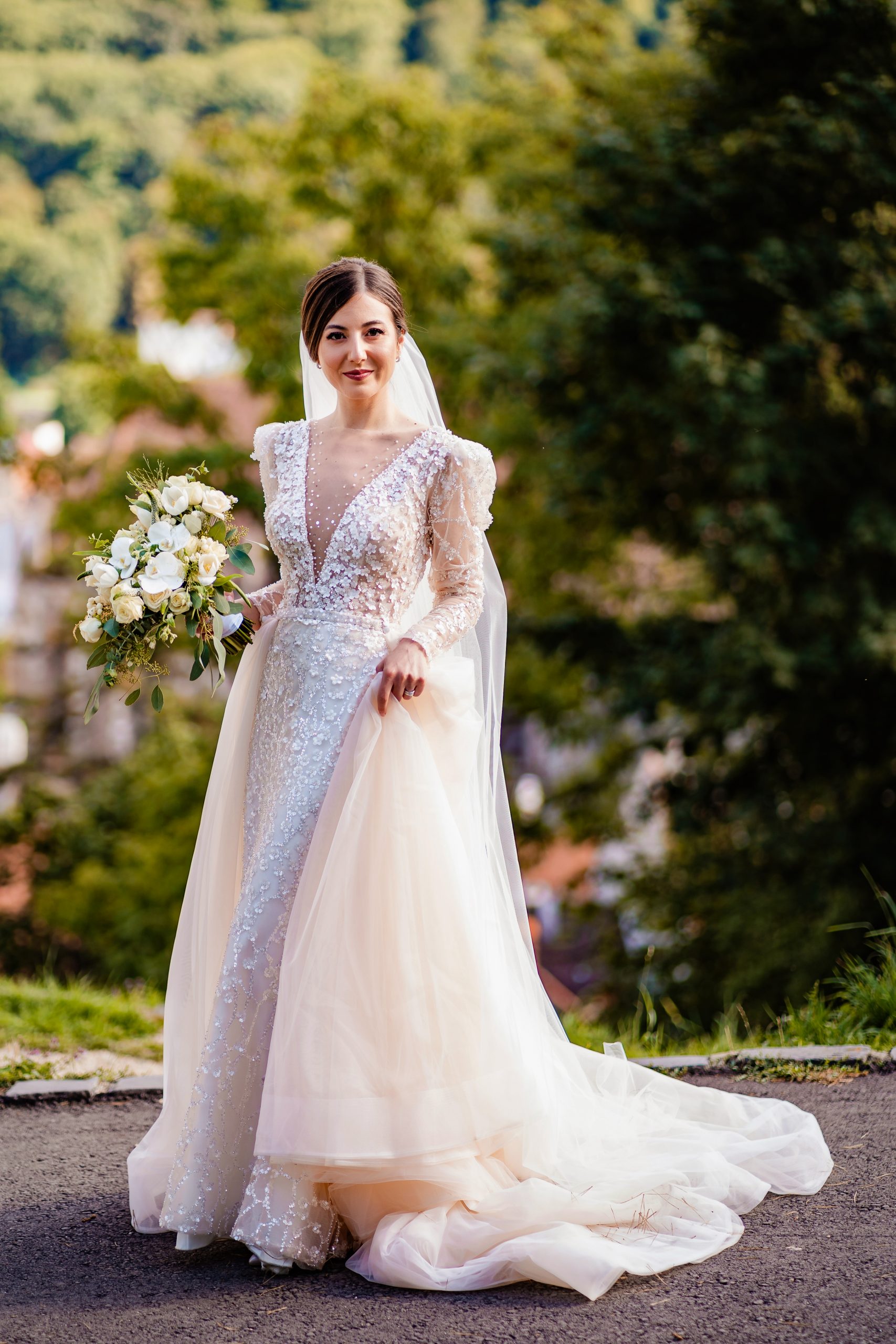Buchet de mireasa bujori, lisianthus, eucalipt, orhidee. Buchet de dimensiune mare cu durata de viata de 1 zi.