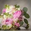 Buchet de mireasa cu bujori albi, bujori roz, frezii, matthiola, wax flower si eucalipt.