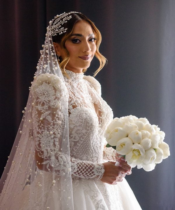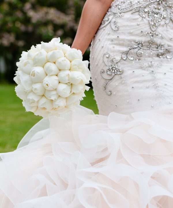Buchet de mireasa realizat pentru Bella Santiago cu bujori albi. Buchet de dimensiune medie, cu o durata de viata de 8-12 ore. Este in sezon in perioada aprilie – octombrie.