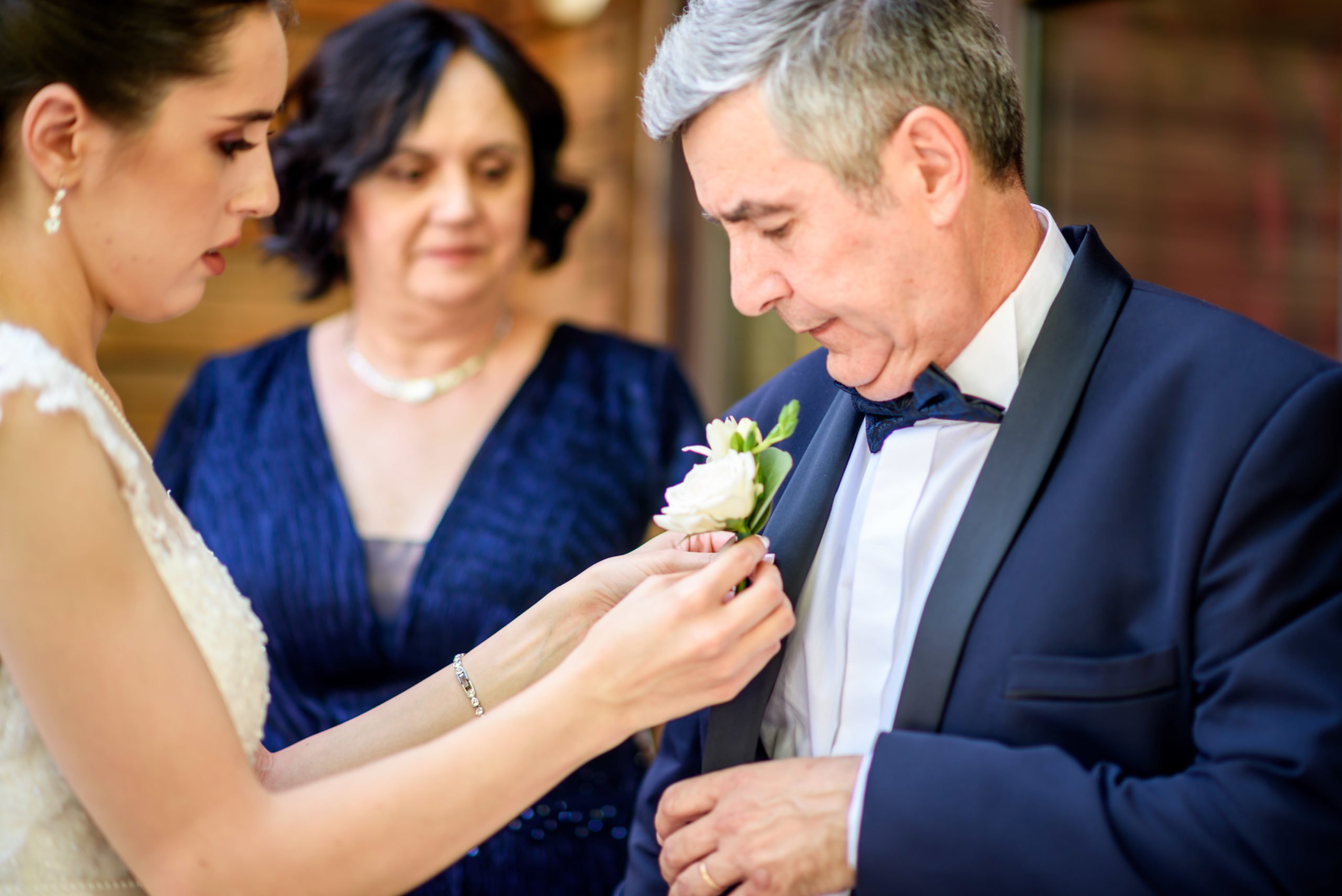 Butoniera alba din trandafiri, frezia alba, lucrata pe magnet ca suport de prindere. Trandafirii si freziile au o durata de viata de aproximativ 6h, se recomanda pentru parinti si cavaleri. In functie de dorintele mirilor ele se pot asorta cu cravata sau papion. Dimensiunea lor este medie.