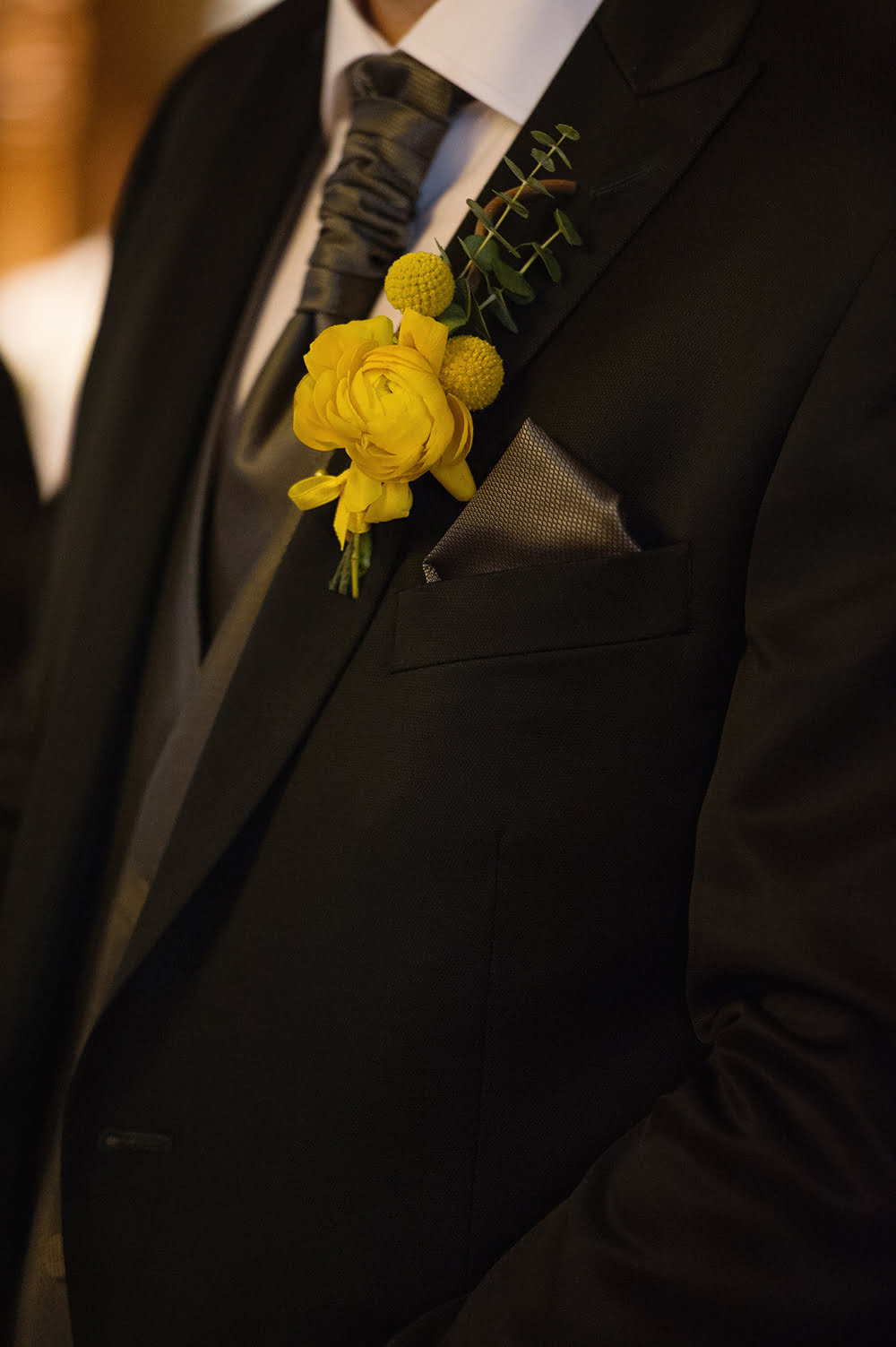 Butoniera galbene din ranunculus, craspedii si verdeata, lucrata pe magnet ca suport de prindere. Ranunculus are o durata de viata de aproximativ 6h, craspediile nu se ofilesc, se recomanda pentru parinti si cavaleri. In functie de dorintele mirilor ele se pot asorta cu cravata sau papion. Dimensiunea lor este medie.