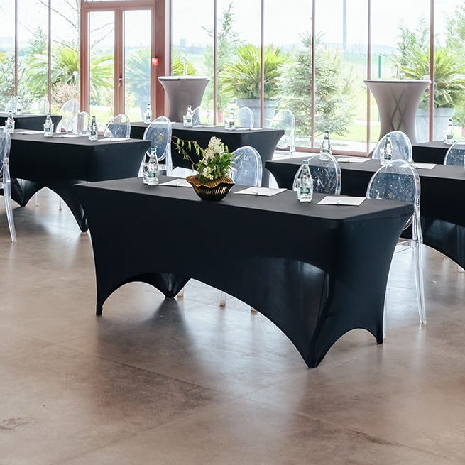 Un detaliu practic și elegant pentru set-up-ul de eveniment. Husa elastică pentru masă dreptunghiulară acoperă perfect suprafața mesei și îi oferă un aspect modern, bine definit și uniform.