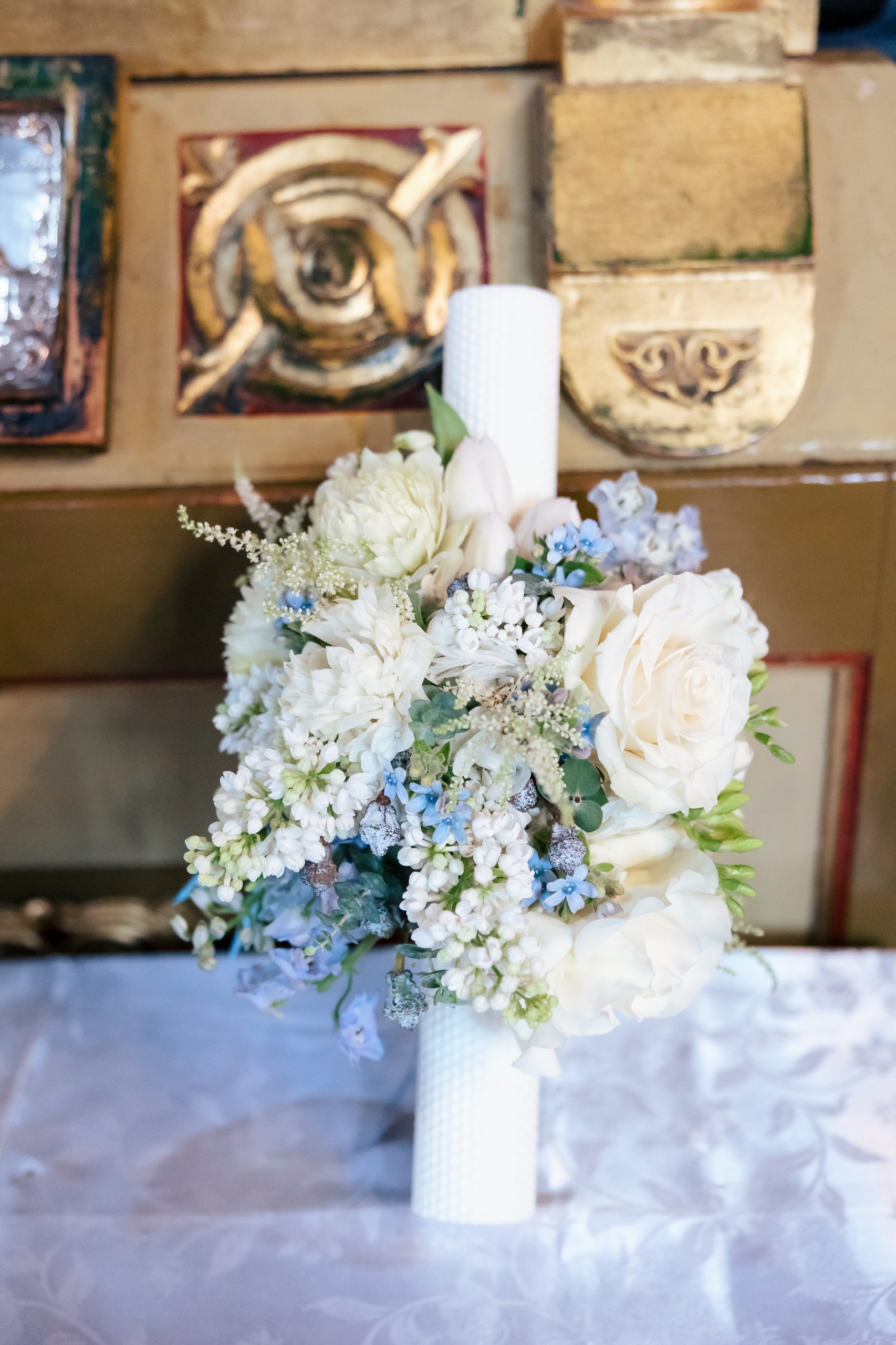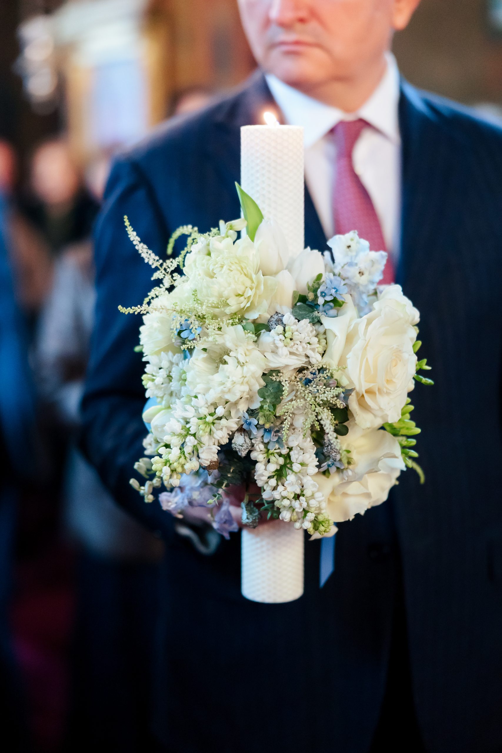 Lumanare de botez pentru baietel, din ceara naturala fagure, cu decor floral compus din liliac, trandafiri, lalele, frezii, oxypetalum, astilbe si eucalipt.