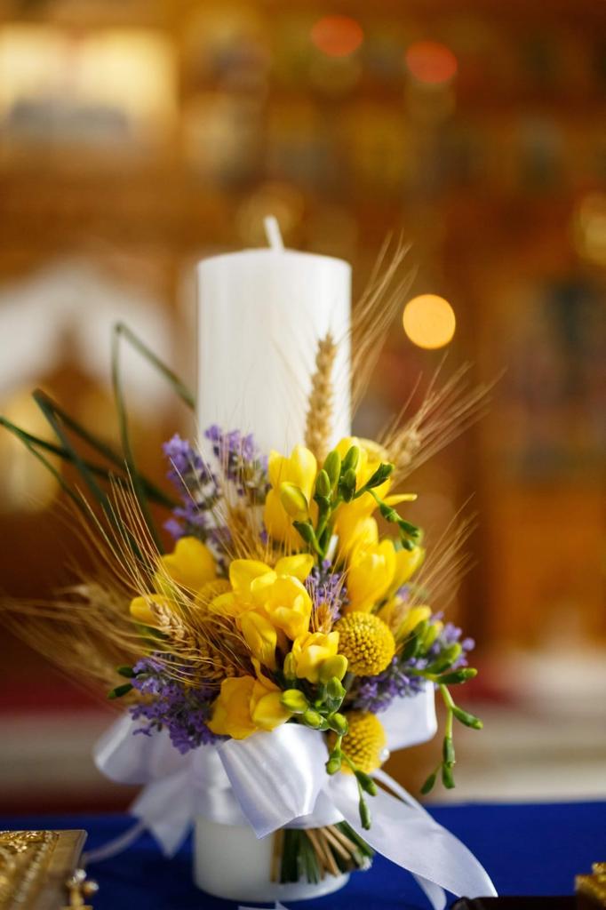 Lumanare de botez cu frezii, craspedii, spice de grau si lavanda.