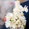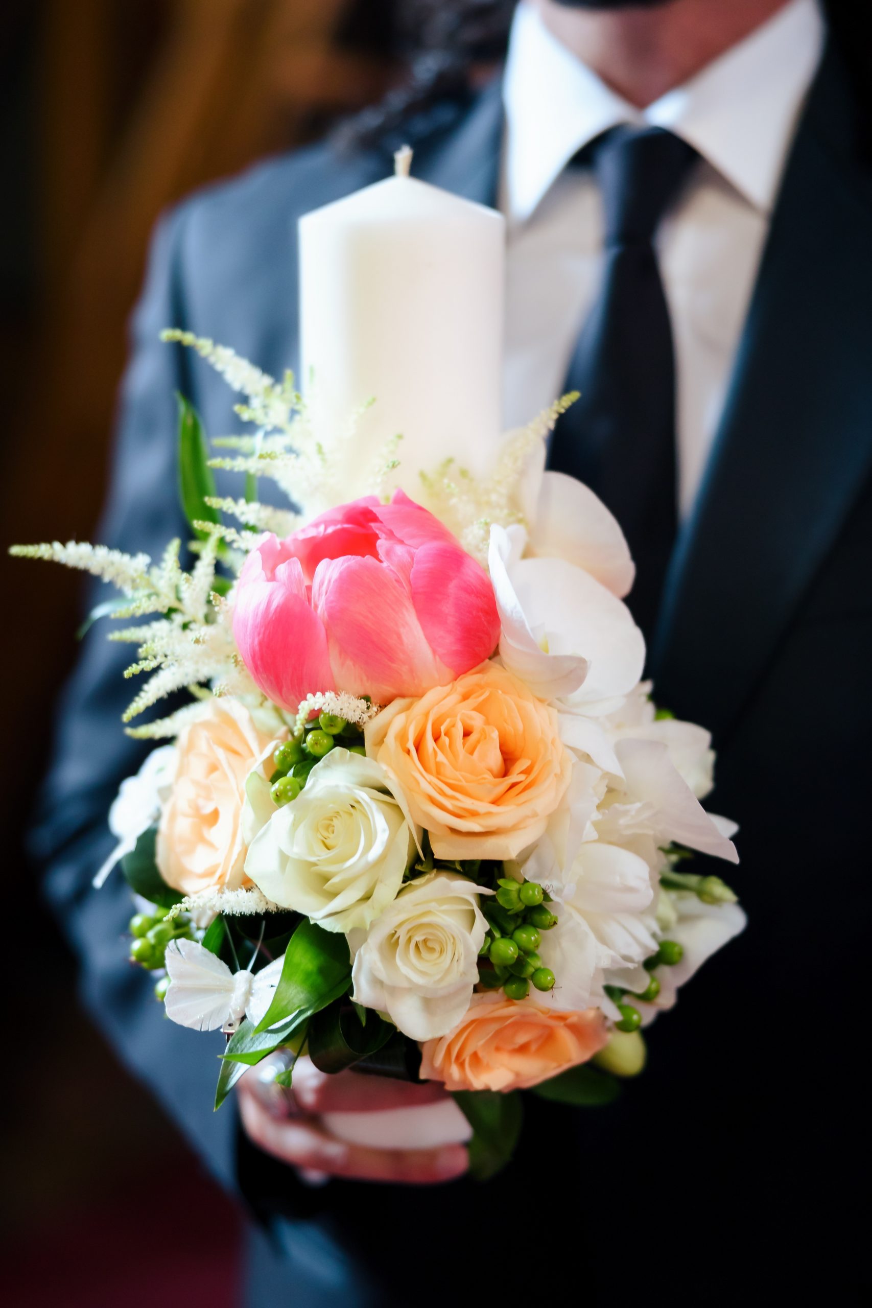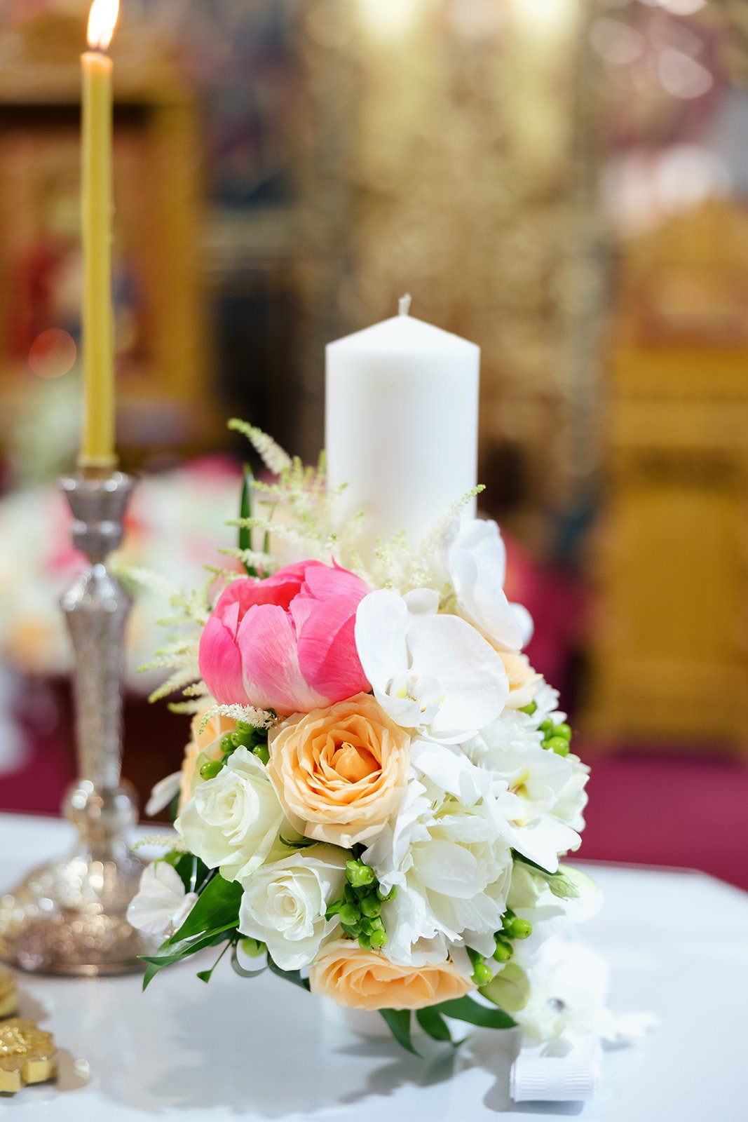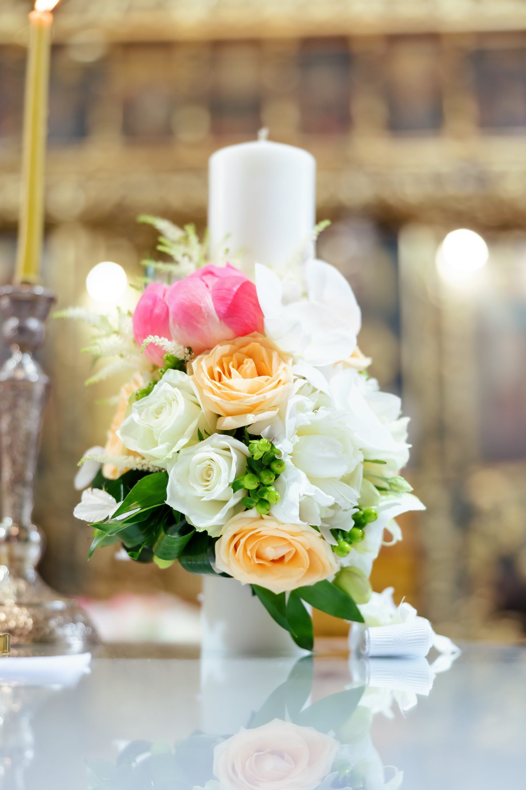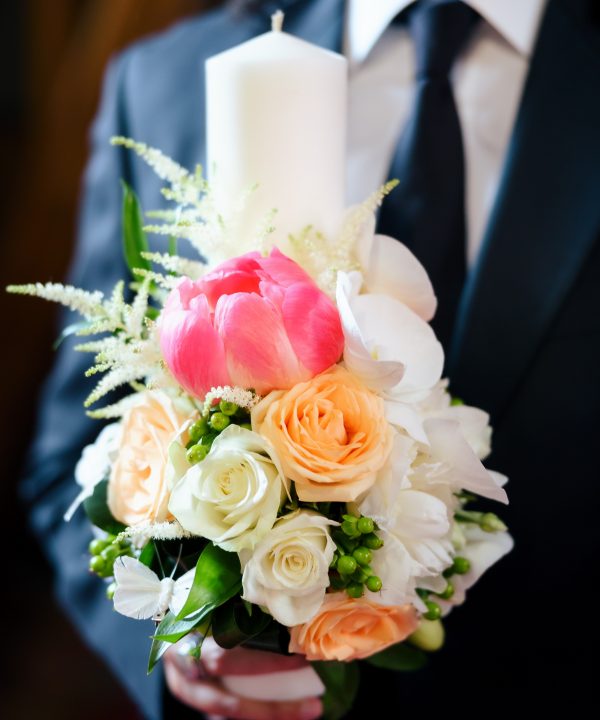 Lumanare de botez cu bujori, trandafiri, orhidee si astilbe.